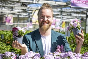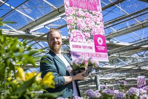 im Foto: Hannes Schrader, Deutsche Blumenfee mit Sachsens Balkonpflanze des Jahres Taffy Pink, in...