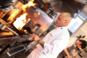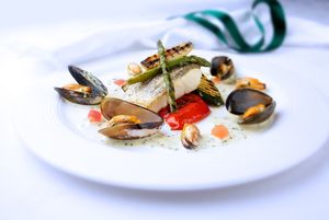 Roast Mallaig monkfish Moray pork cheeks caramelised passion fruit jus.