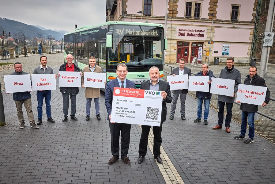 Pirna, 31. März 2022 (tvssw) – Die Sächsische Schweiz baut ihre Vorreiterrolle auf dem Gebiet des nachhaltigen Tourismus‘ in Sachsen aus. Ab Freitag wird die als Fahrschein nutzbare Gästekarte mobil in acht Kommunen an Übernachtungsgäste herausgegeben. Damit erhalten in diesem Jahr erstmals zwei Drittel aller Urlauber in der Region freie Fahrt in öffentlichen Verkehrsmitteln. Die Initiative ist wesentlicher Teil der ambitionierten Nachhaltigkeitsstrategie, die der Tourismusverband Sächsische Schweiz (TVSSW) mit seinen Mitgliedern seit fünf Jahren verfolgt. Unterstützt und mitfinanziert wird das Projekt durch den Verkehrsverbund Oberelbe (VVO) sowie den Regionalverkehr Sächsische Schweiz-Osterzgebirge (RVSOE).
